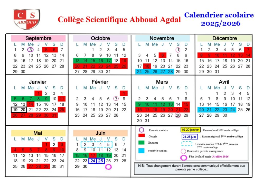 Veuillez trouver ci-dessous le calendrier de l’année scolaire en cours du Collège Scientifique Agdal.